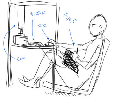 ペンタブを使用するときは体育座り(極限の猫背)から、このような姿勢になりました。